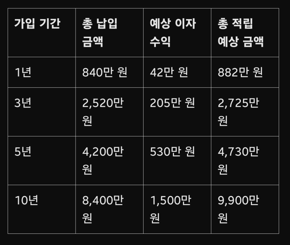📌 월 70만 원 최대 납입 시 (연 5% 이자 가정)